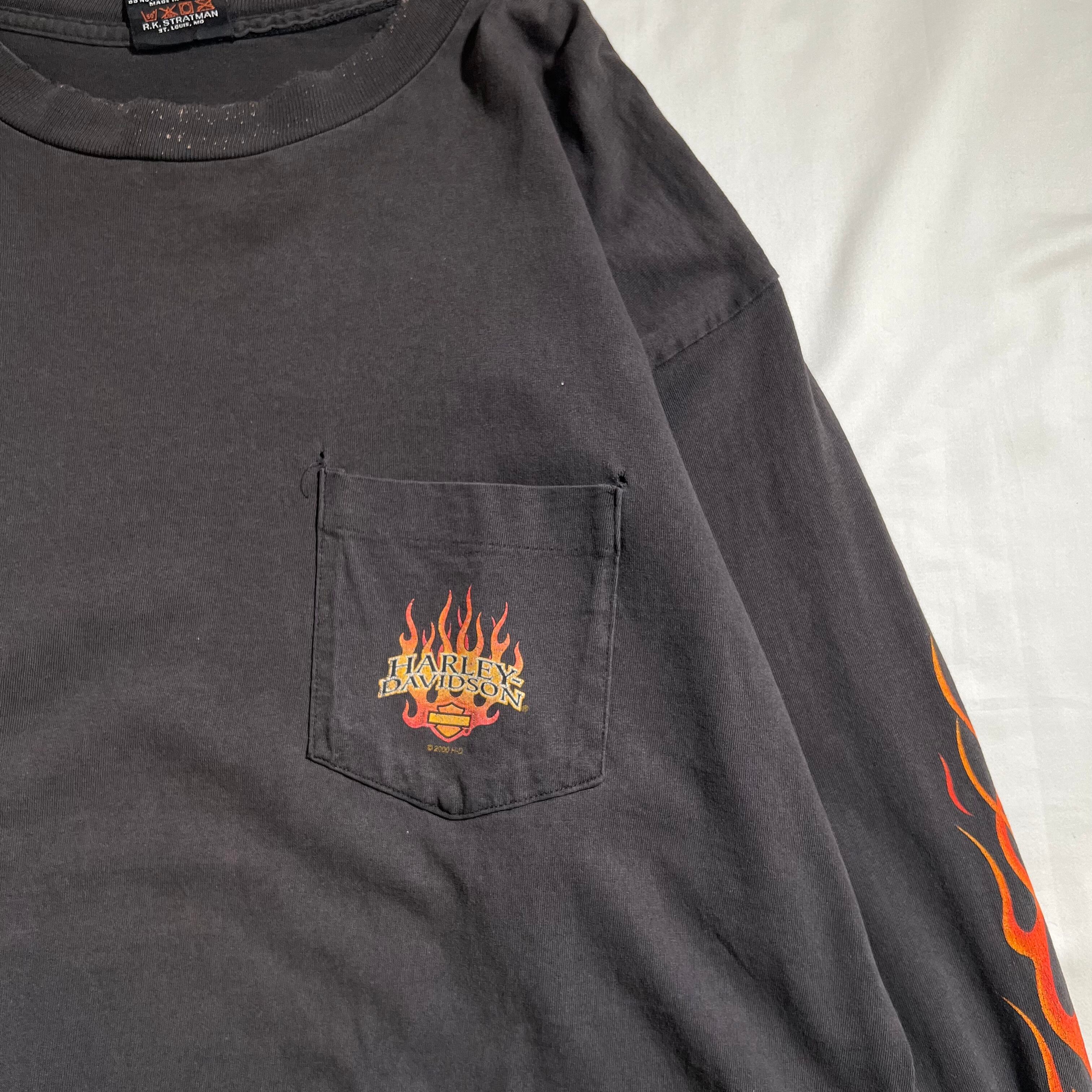 00s "HARLEY-DAVIDOSON " ©︎2000 Flame Pattern Long Sleeve Print T-shirt made in USA Black / Y2K ハーレーダビッドソン 袖フレイム ロンT USA製 黒 裾シングルステッチ